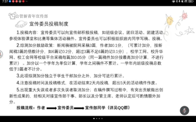 会议伊始,主持人何晶晶以“宣传委员评分考核制度”为核心展开讲解。培训详细解读考核指标体系,围绕“投稿内容、综测加分鼓励政策”等展开,让宣传委员清晰工作方向与评价标准,鼓励宣传委员与同学们积极参与院系与班级活动的新闻投稿。