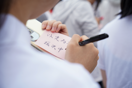 接着,同学们有序上台,共同粘贴抗战胜利纪念照片、书写强国誓言描绘出中国地图的轮廓。一张张黑白照片串联起厚重的历史,一句句心愿贴汇聚成新中国的点点星火。