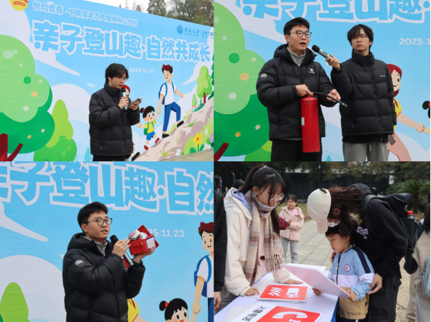 活动伊始,岳麓山校区图书馆前坪秩序井然,志愿者与参与家庭顺利完成对接。研究生王安桐开展消防知识科普宣讲,有效提升了家庭的消防安全认知,为活动拉开序幕。随着热身环节结束后,主题登山活动正式启航,志愿者与亲子家庭携手向山间进发。