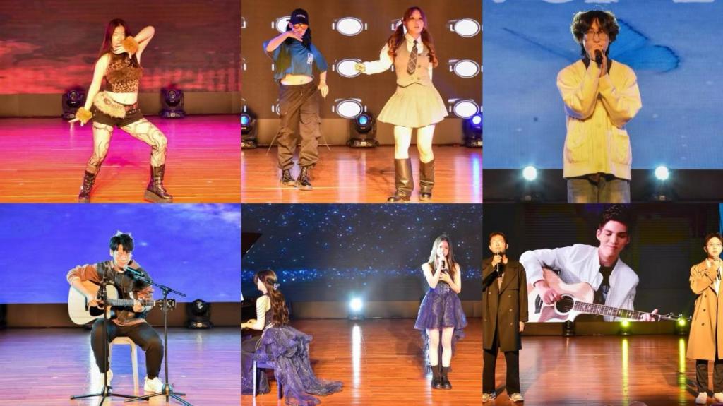 舞蹈类节目同样亮点纷呈。张雅馨、杨雅琴、吴曾慧蓉、周国仪四人带来的《You&Me》,展现青春活力;吴蓓蓓、梁书睿、吴欣悦的舞蹈串烧《Toxic+Killin'It Girl》引爆现场。合作类节目则尽显团队默契与温情。王姝玥与彭薰加的钢琴伴唱《Take Me Hand》,浪漫与热烈交织;黄殿贻、于博安、李若水合唱《一荤一素》,唱出“家”的诗意。;艾祉墨与黄凯的《告白气球》让快乐随歌声传递。
