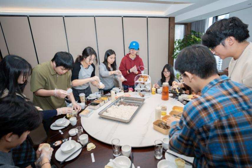 辛勤的劳作之后,是充满米香与温情的回味。活动的第二站,同学们前往温德姆酒店,体验了一场别开生面的“手作饭团”与湘台稻作风味午餐。大家亲手将晶莹的米饭放入模具中,包裹上各式食材,制作属于自己的饭团,这一过程充满了欢声笑语。这顿午餐不仅慰藉了肠胃,更在两岸青年共同的饮食记忆里,找到了最朴素也最深切的文化共鸣。
